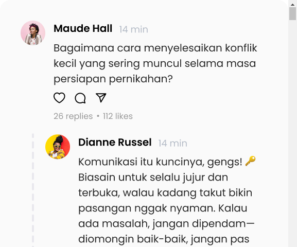 Punya pertanyaan tentang pernikahan atau keluarga? Tanyakan di Bisik dan dapatkan jawaban langsung dari pengalaman nyata pengguna lainnya.