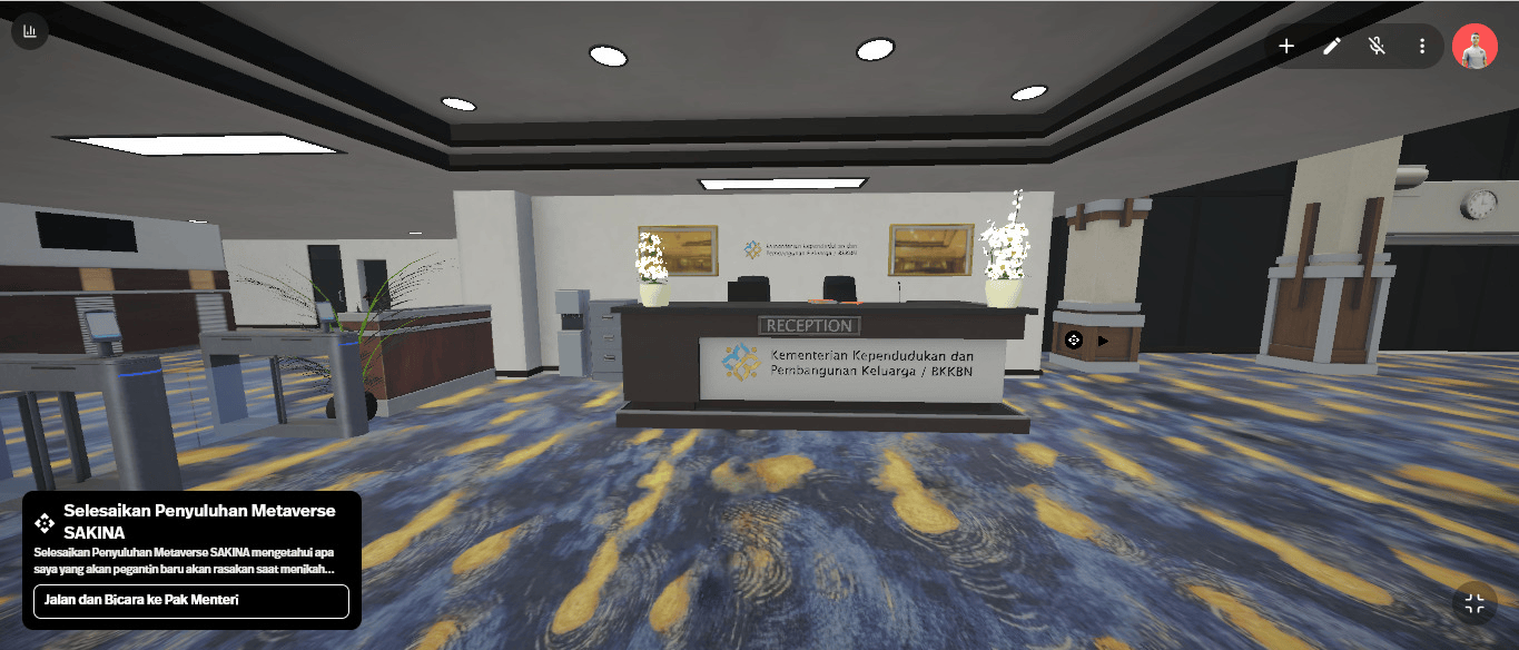 Rasakan pengalaman interaktif dalam dunia Metaverse yang memvisualisasikan perjalanan calon pengantin menuju pernikahan yang matang. Dipandu oleh avatar Menteri Kependudukan, Anda akan melewati tahap demi tahap dalam persiapan pernikahan dengan cara yang seru dan mendalam!